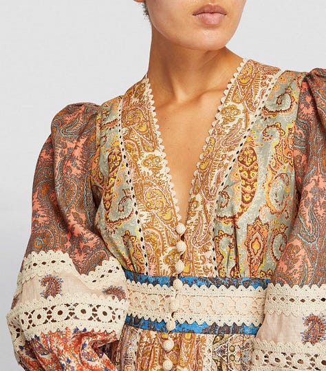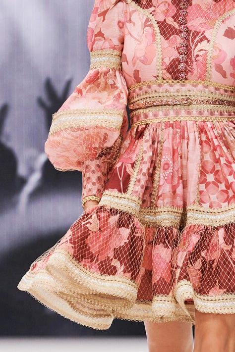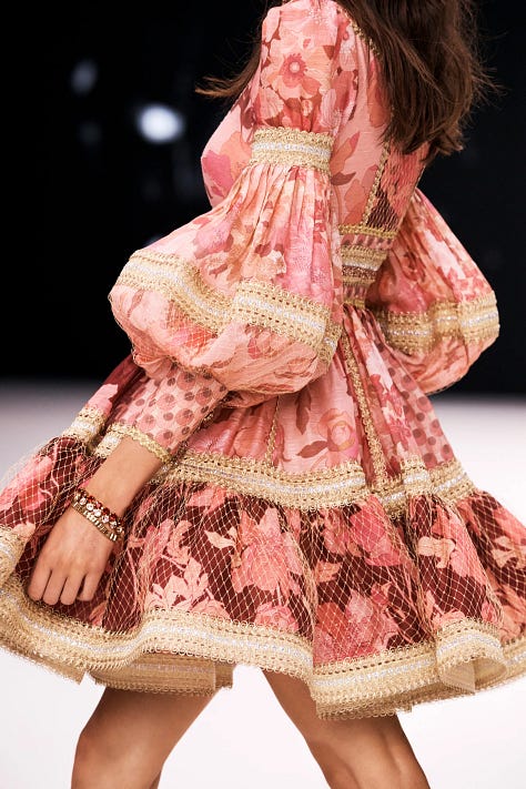 Zimmermann’s Hypnotic collection, for example, fused Victorian lace, dusty rose silks, and hand-drawn cartography, bringing warmth and imagination to a Paris drenched in gray skies.