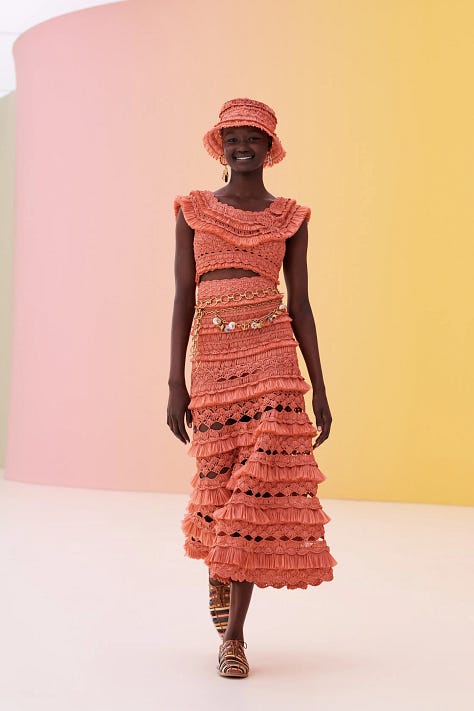 Crafted Volume — Soft pleating, crocheted detailing, puffed sleeves, and tactile smocking define both apparel and upholstery.